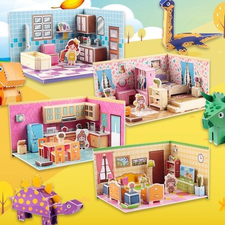 4PCS/Set Mainan Edukasi Interior Rumah DIY Puzzle 3D Miniatur Kertas Busa DIY Besar Mainan Craft 3D Mainan Anak Perempu