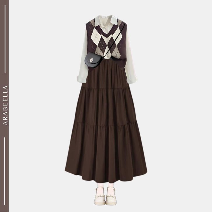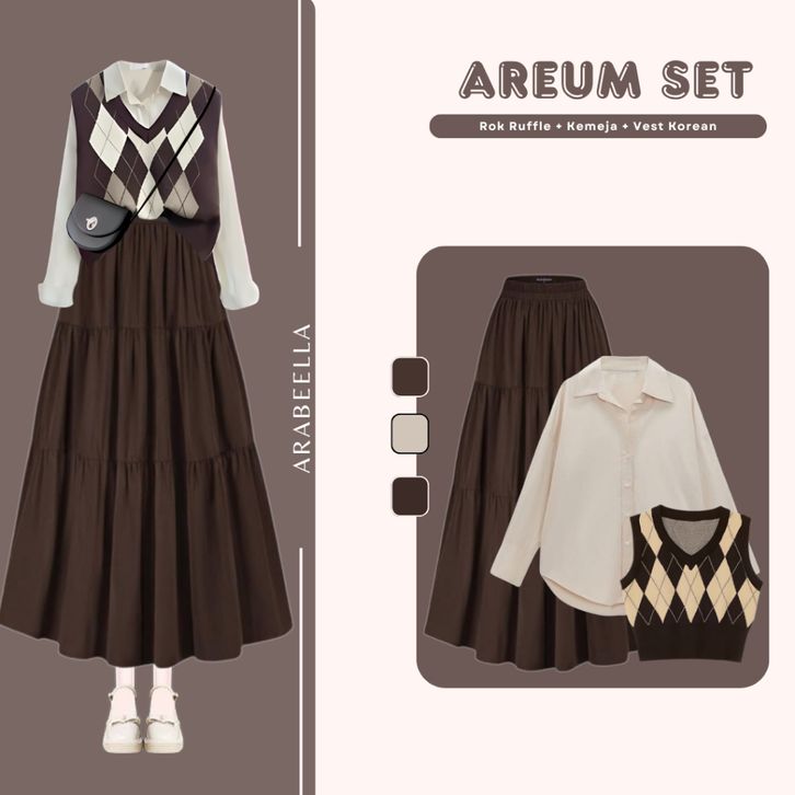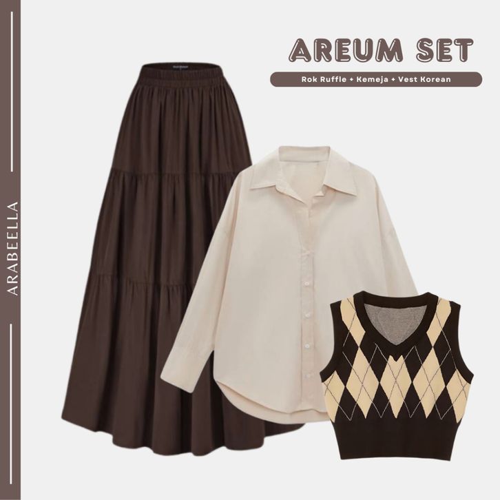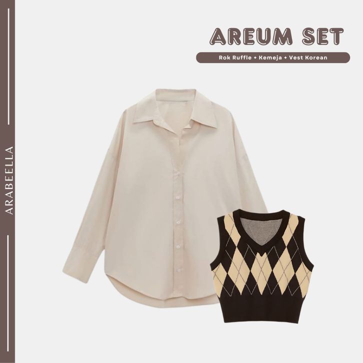 Setelan Wanita Areum /Rok Ruffle / Kemeja Basic / Vest Rajut / One Set Korean /Outfit Simple Hangout