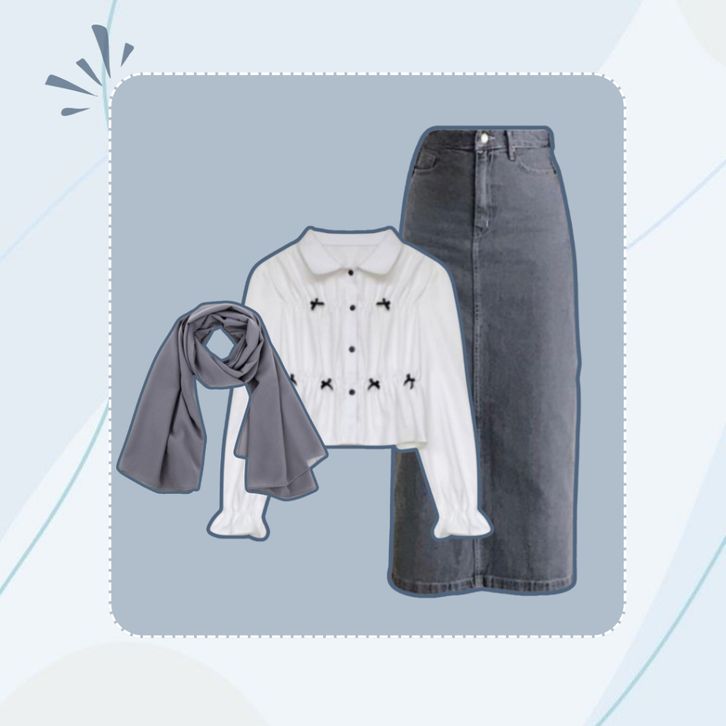 One set Wanita Korean Style 3in1 Hijab OOTD Outfit Kekinian (Kemeja krut pita+rok jenas+Hijab).One Set Remaja Dewasa Kek