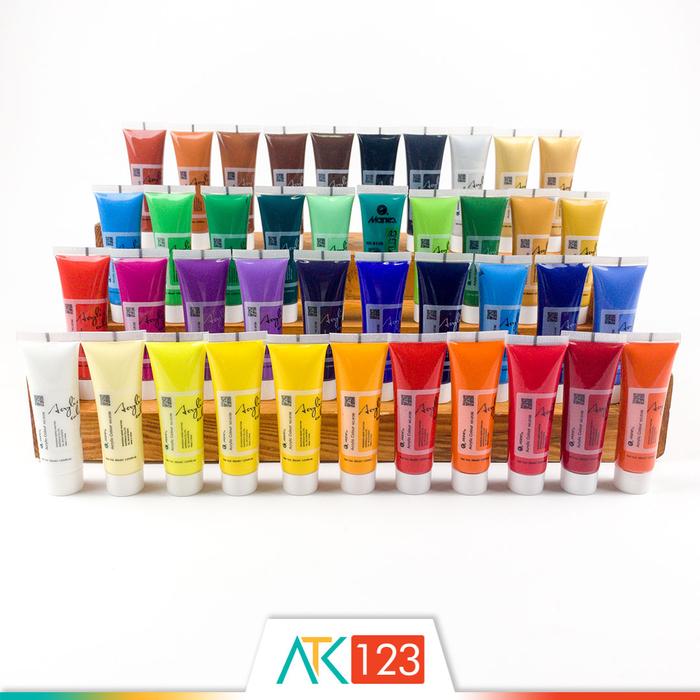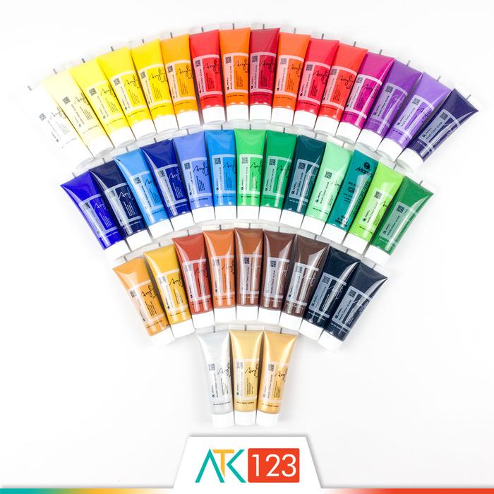 Black, Brilliant Purple, Burnt Sienna, Burnt Umber, Cerulean Blue, Cobalt Blue, Crimson, Dioxazine Violet, Emerald Green, G00ld, Green Mid, Green Pale, Lemon Yellow, Light Red, Naples Yellow, Orange Red, Orange Yellow, Pale G00ld, Payne's Grey, Permanent Orange, Permanent Red, Phthalo Blue, Phthalo Green, Prussian Blue, Purple Pale, Raw Sienna, Raw Umber, Rose, Sap Green, Scarlet, Silver, Sky Blue, Titanium White, Ultramarine Blue, Vandyke Brown, Vermilion, Viridian, Yellow Mid, Yellow Ochre, Yellow Pale, Yellowish Green