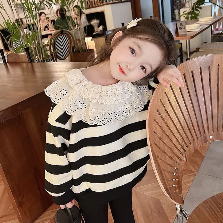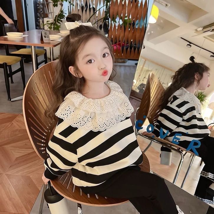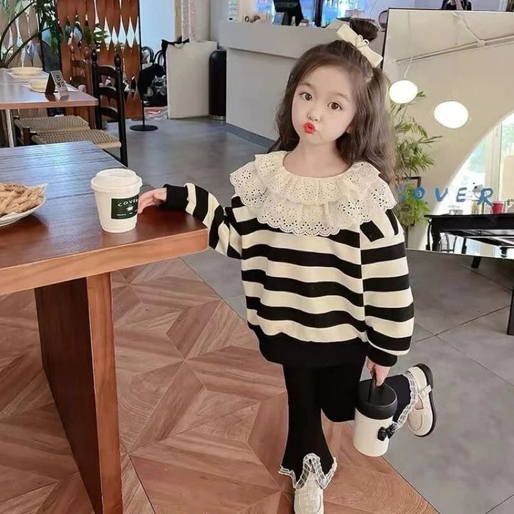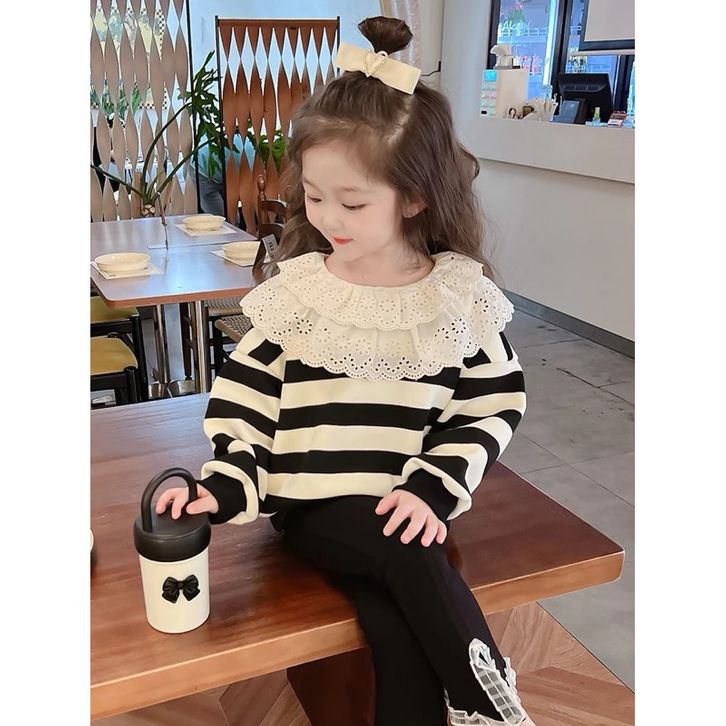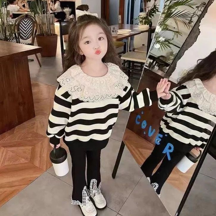 2-10Tahun Setelan panjang brukat layer celana cutbray baju anak perempuan hitam putih