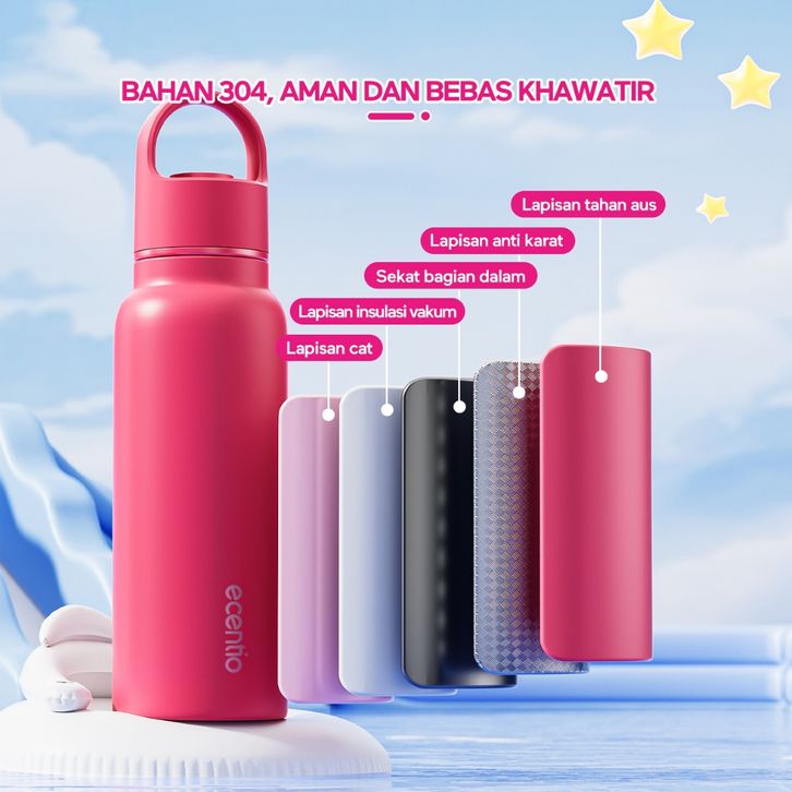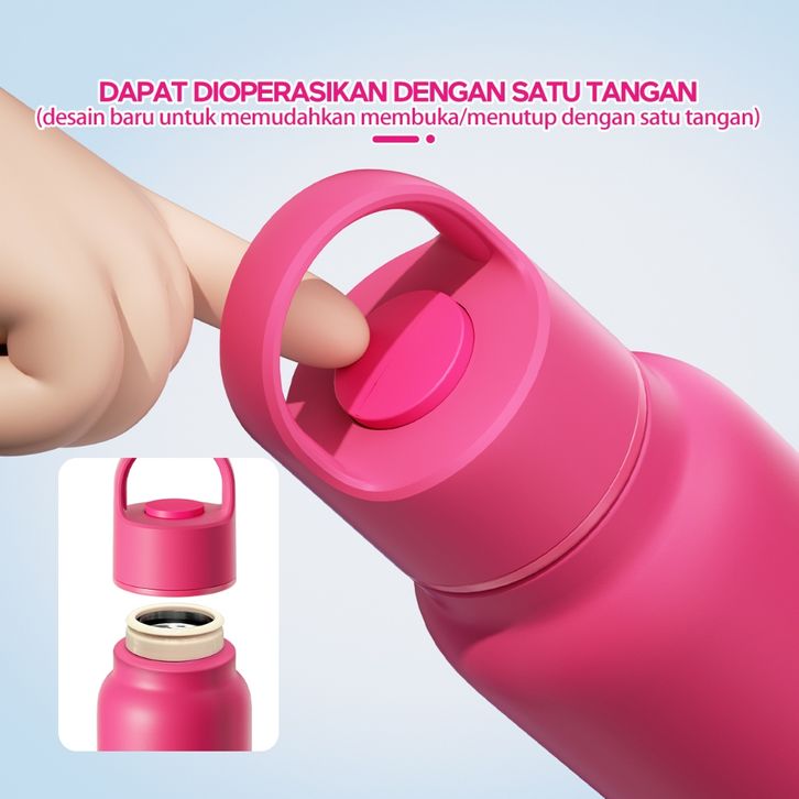 ecentio tumbler minum stainless pink dapat membuka tutup dengan satu tangan sport lari olahraga 650mili termos tumbler