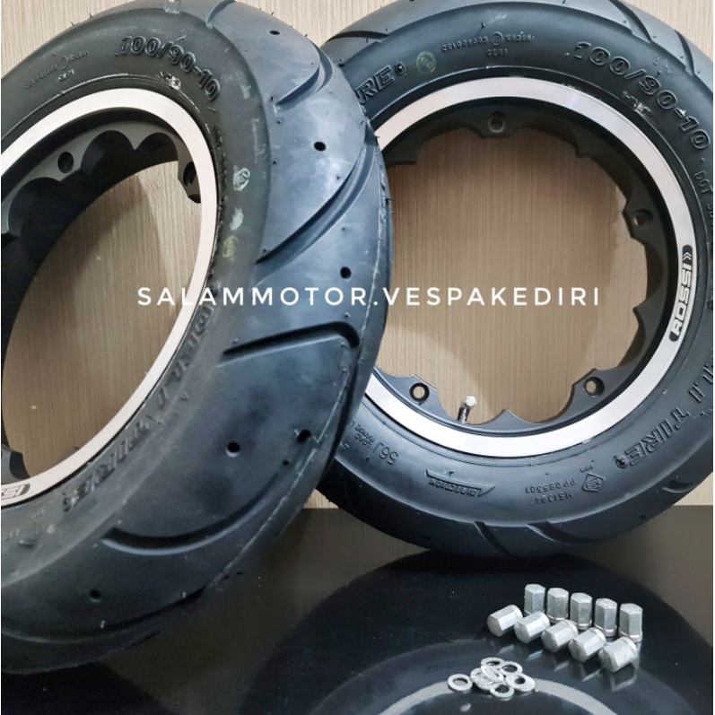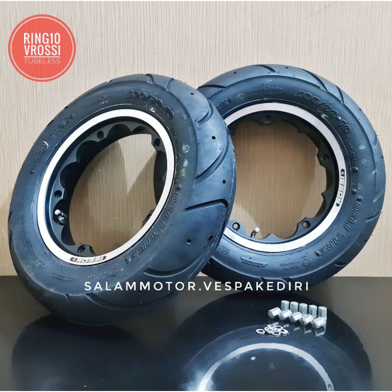 Paket velg ban vespa Ring 10 Velg Vrossi VRX Black Chrome Ban Delitire S224 100/90-10 TUBELESS plus instal