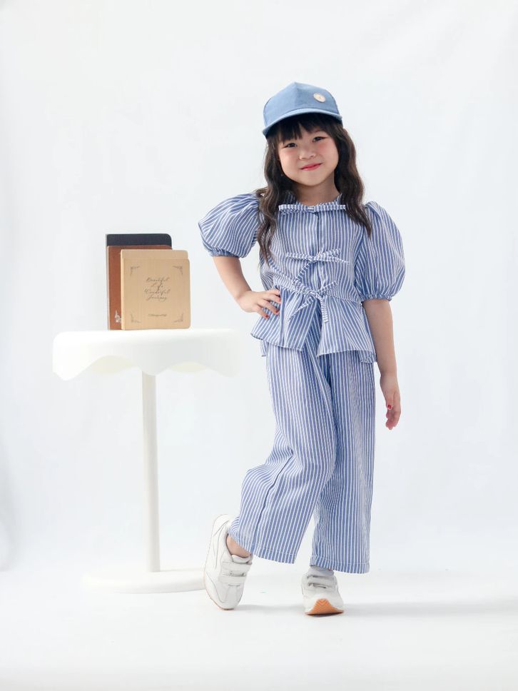 Setelan Anak Perempuan Clara Oneset Setelan Katun Salur Lengan Balon Celana Kulot Anak Perempuan 1-8 Tahun