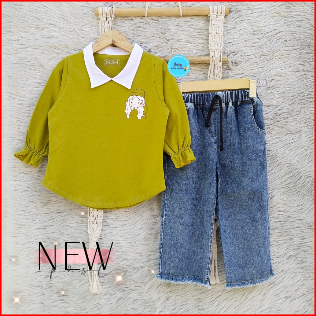 Galery Kids Setelan Kaos Anak Perempuan Lengan Panjang Umur 3-12 Tahun Katun Combed Denim Kulot Cewek Setelan