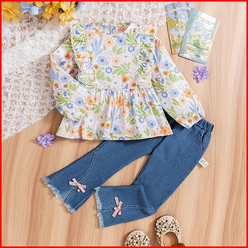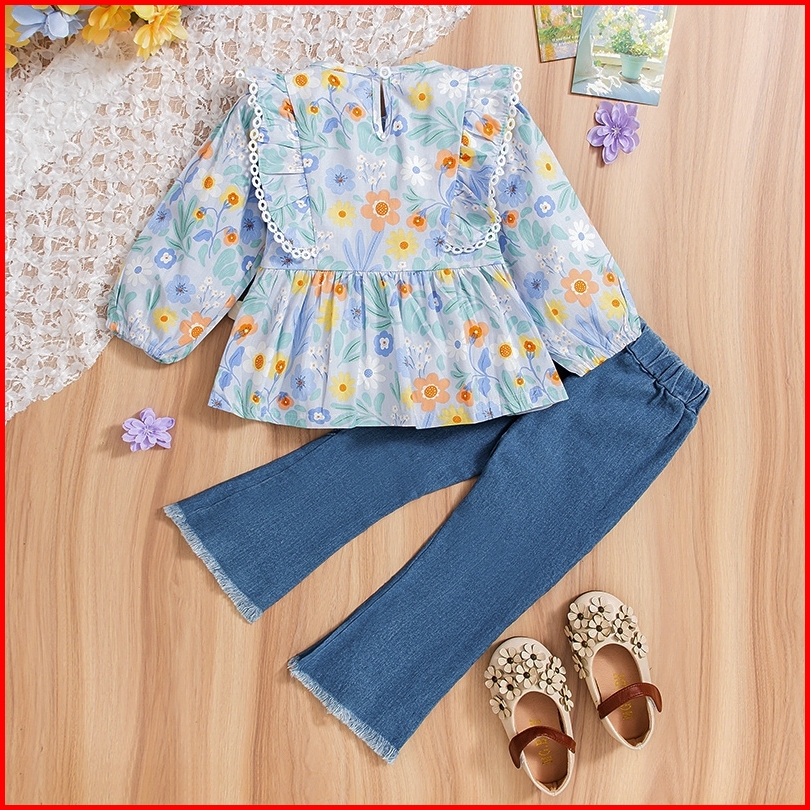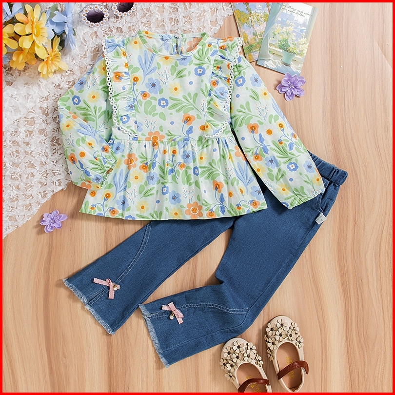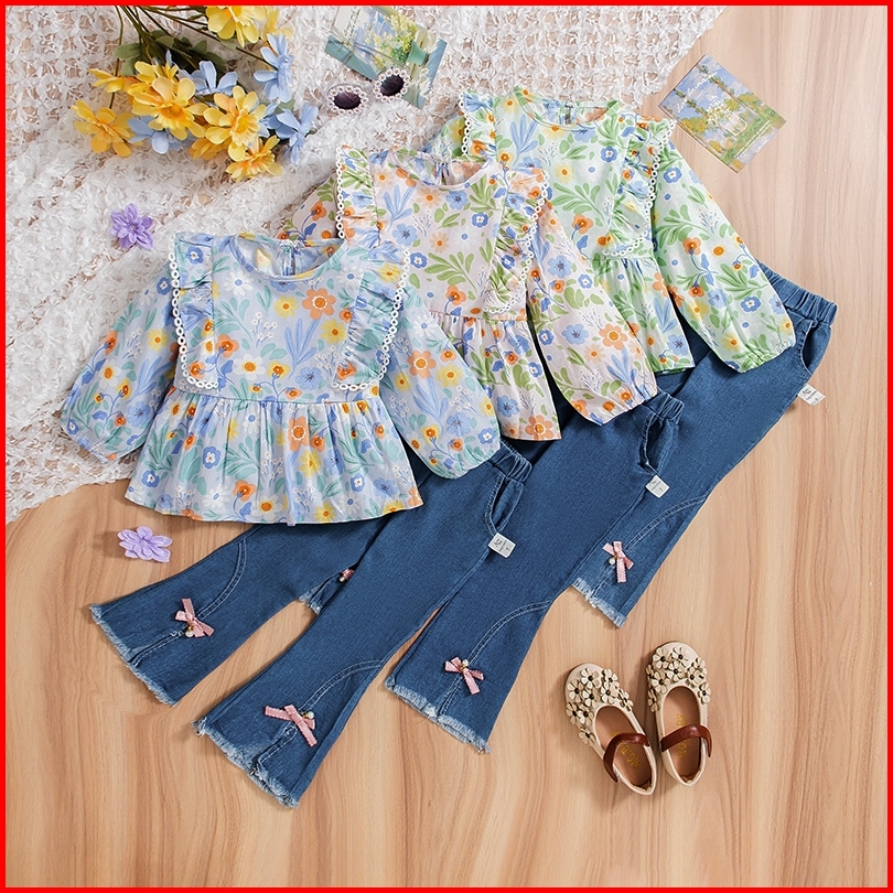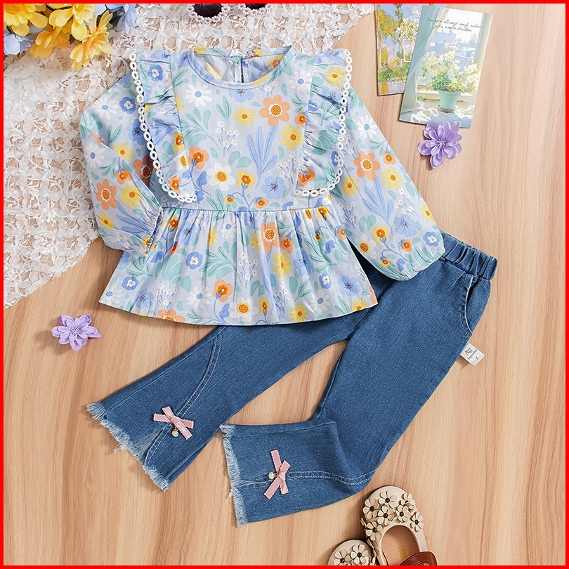 Twinkle Setelan Baju Anak Perempuan Lengan Panjang Bahan Katun Motif Bunga Usia 1-4 Tahun