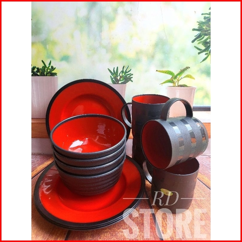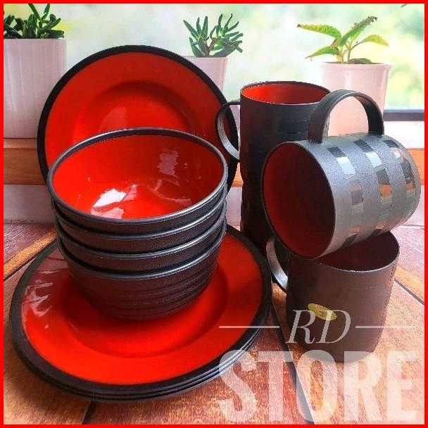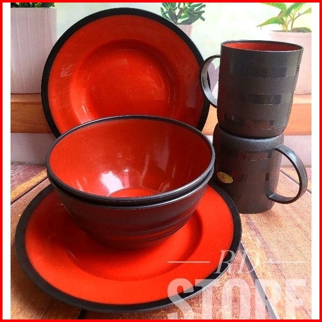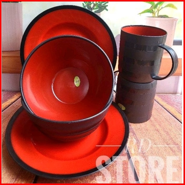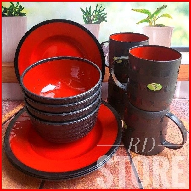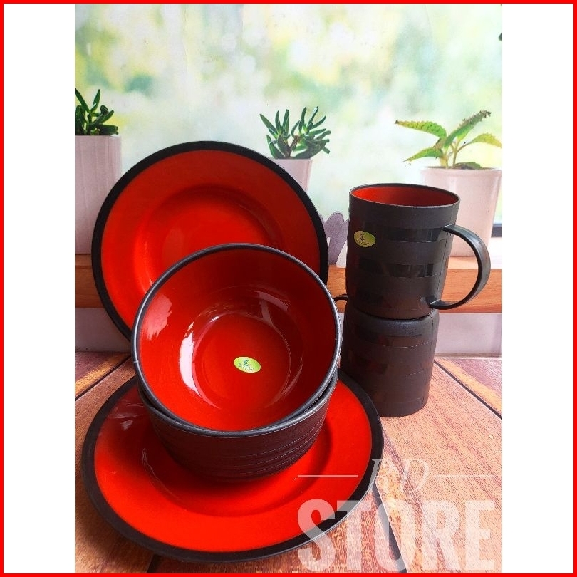 Promo 12.pcs Isi 4.piring Makan 4.mangkok Ramen 4.cangkir Gagang Multiwarna...