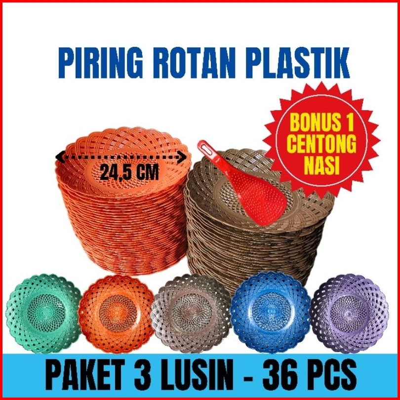 Paket 36 Pcs 3 Lusin Piring Rotan Plastik Anyaman Rotan