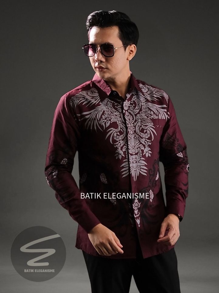 Batik Eleganisme BURGUNDY AKSARAGA Katun Furing Kemeja Batik Pria Lengan Panjang Modern premium