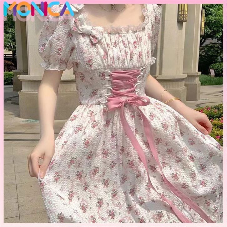 Dress Korean Style Monica Panas Rok Persik Perancis Rework Pita Pinggang Tinggi Slim Strap Bunga Long Dress Wanita