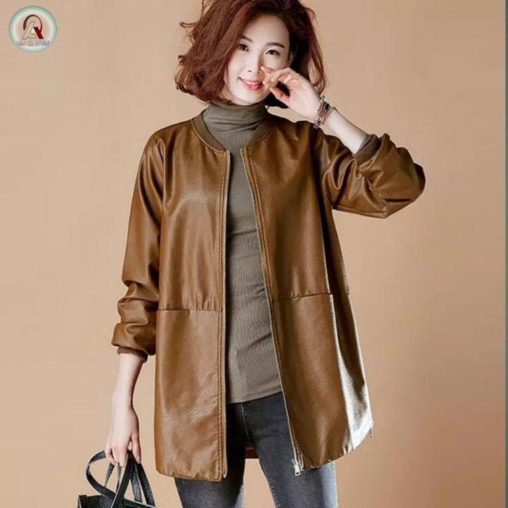 JAKET KULIT SINTETIS LONGGAR WANITA 2024 MODEL MANTEL DASAR LENGAN PANJANG BIKER WANITA