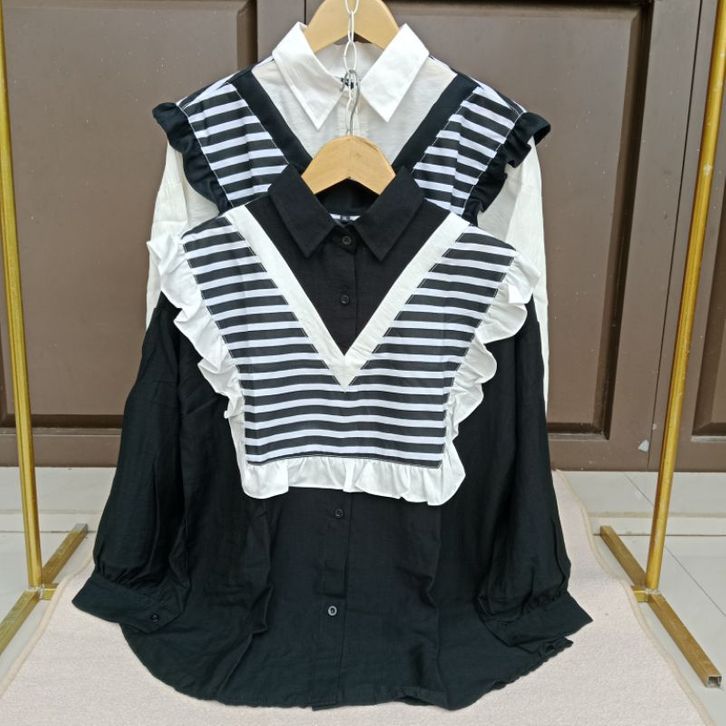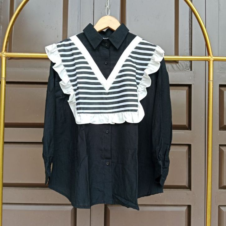 blouse shirt Alika ruflle polo linen mix katon salur size M L XL XXL XXXL 5L