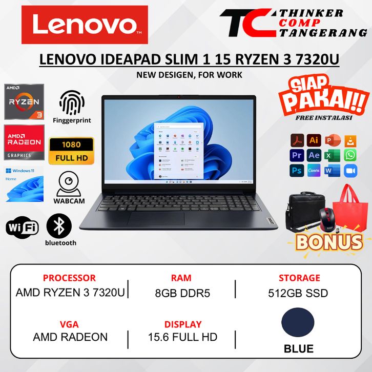 Laptop kantor Lenovo Ideapad Slim 1 15 Ryzen 3 7320U 8GB 512GB SSD 15.6 Inch Full HD Windows 11 Home