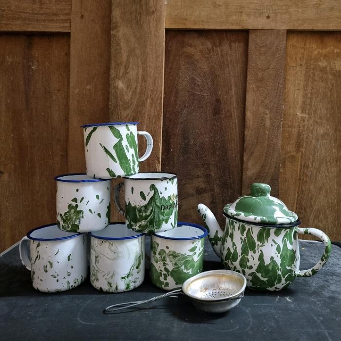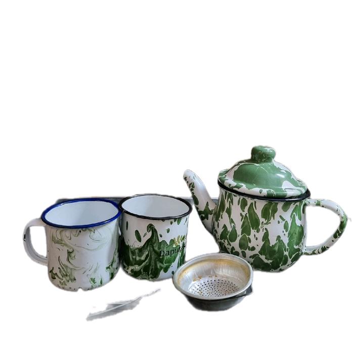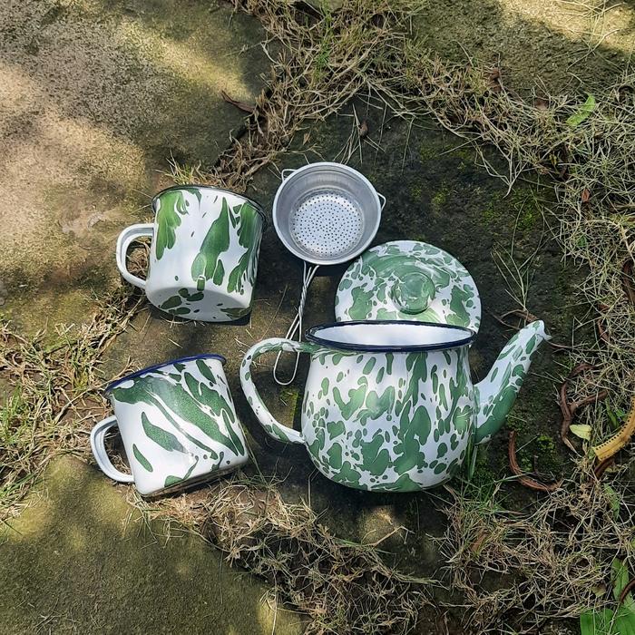Set Teko cebol + Gelas 7cm Enamel + Saringan Teh vintage Bunga Hijau tea set
