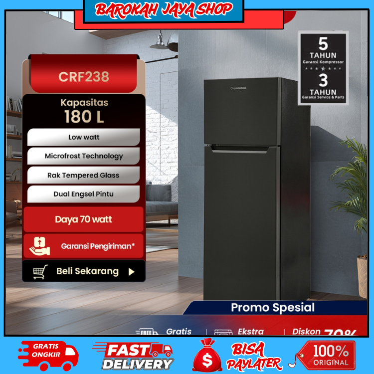 badgeChanghong Kulkas 2 Pintu(Refrigerator)Lemari Es Kapasitas 180 Liter CRF238–Black(Semi Auto No Frost)Kapasitas Besar