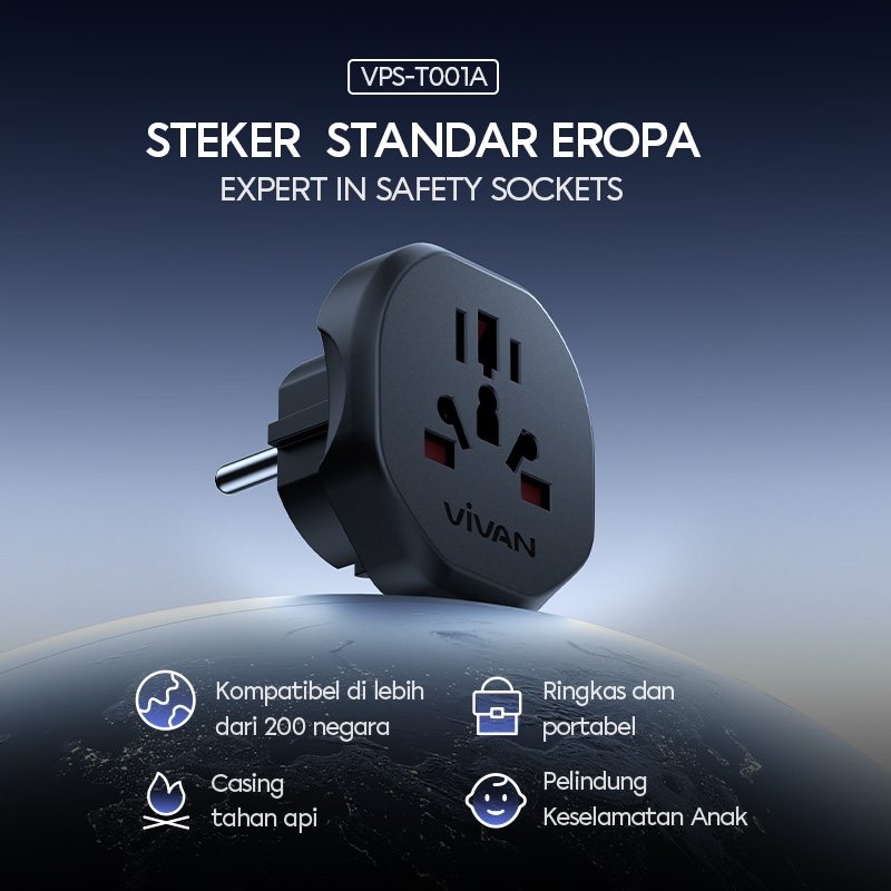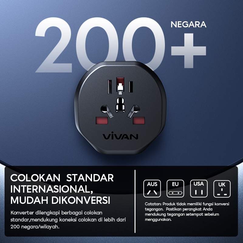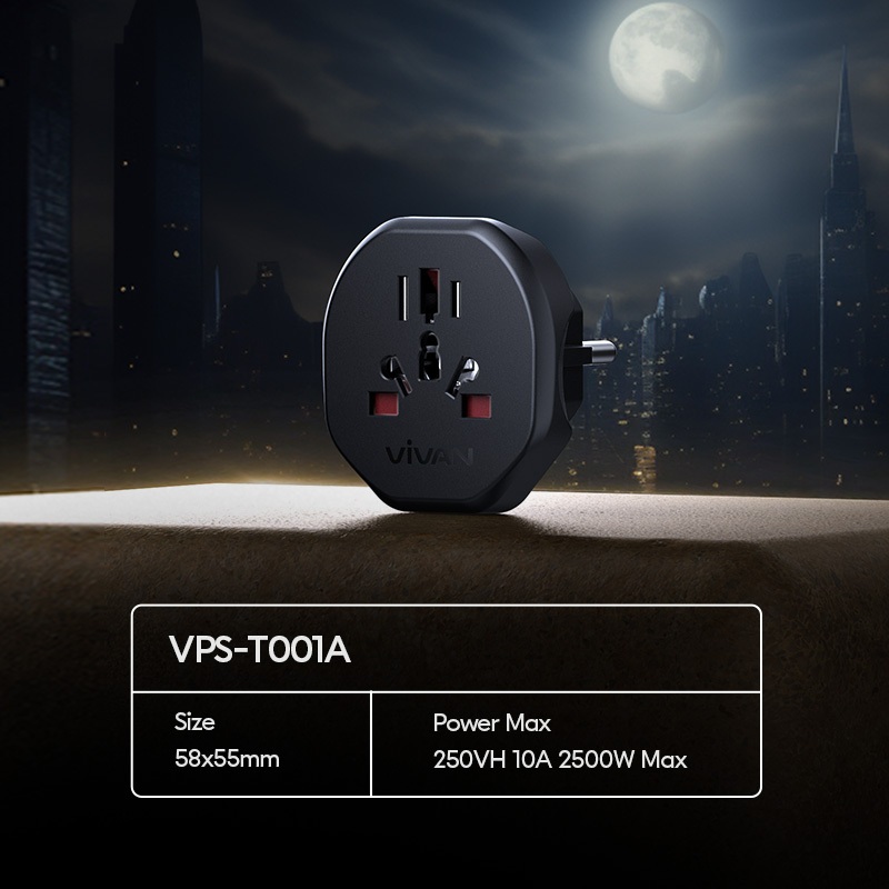 VIVAN TRAVEL ADAPTOR VPST001A MULTICOUNTRY POWER ADAPTER UNIVERSAL COLOKAN LISTRIK FAST CHARGING STEKER SOCKET PORTABLE STANDAR INTERNASIONAL BLACK ORIGINAL GARANSI RESMI 36 BULAN