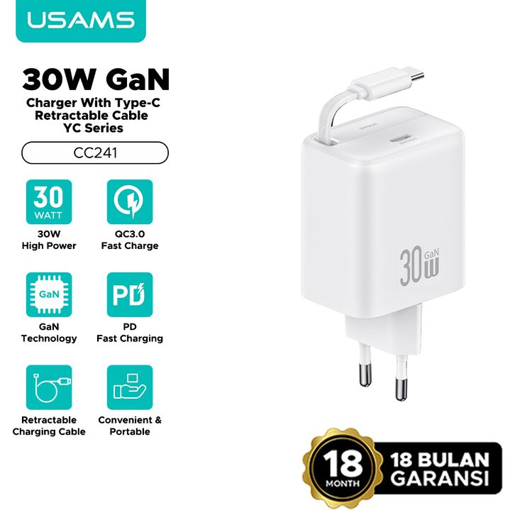 USAMS Kepala Charger GaN 30W & 20W Fast Charging + Kabel Type C 80cm iPhone Android CC241 CC233