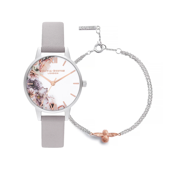 Olivia Burton Water Color Florals Grey Lilac Leather 30mm & Bracelet Gift Set - OBGSET45