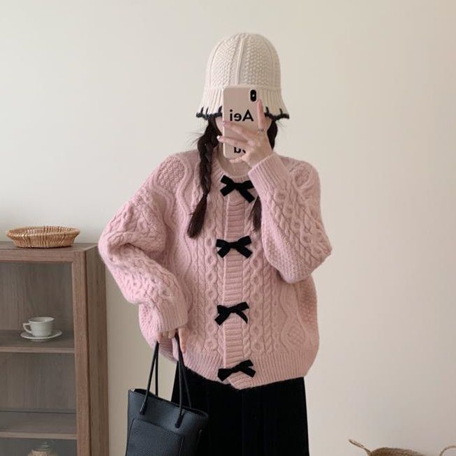 SHENNING Cardigan Rajut Pita Besar Simple Leher Bulat