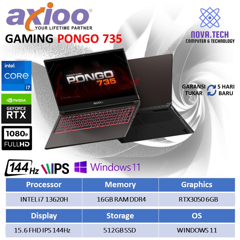 Axioo Pongo 735 RTX3050 6GB Core i7 13620 Ram 16gb 512gbSsd Layar 15.6FHD 144Hz IPS RGB Windows 11