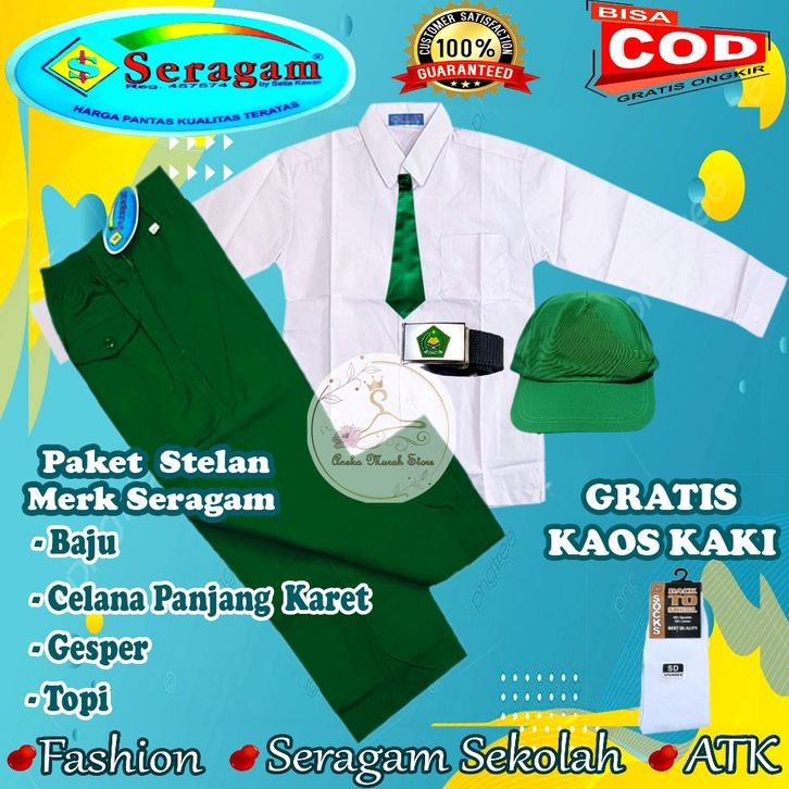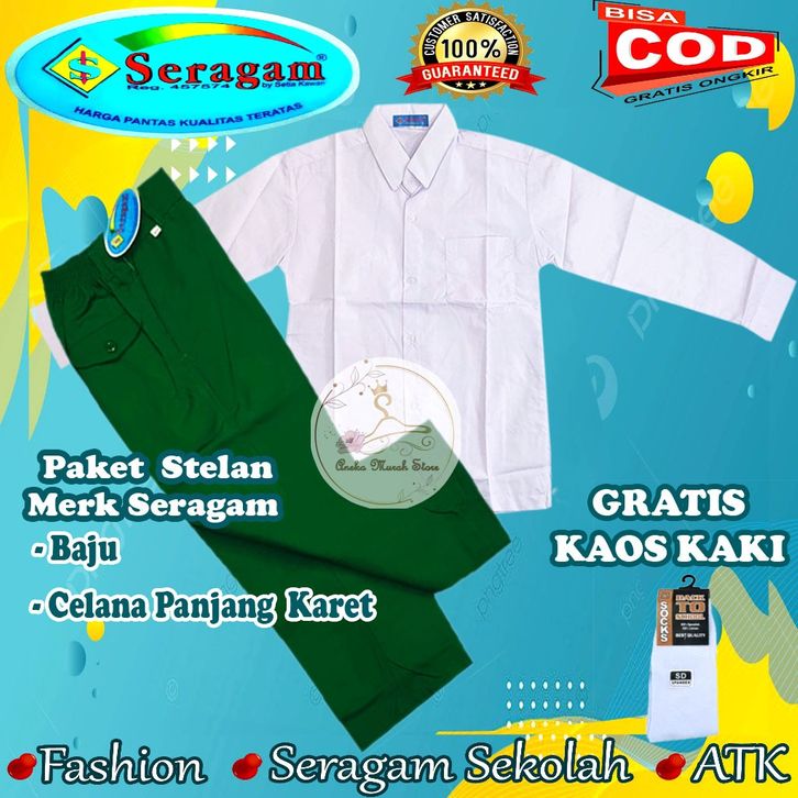 Setelan Paket Hemat Seragam Sekolah MI Lengan Panjang Celana Panjang Hijau MI Pinggang Karet Merek Seragam