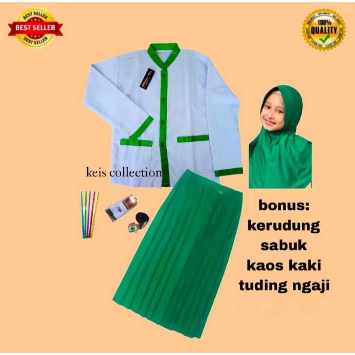 Setelan Seragam SD/MI List Hijau Anak Perempuan | Seragam Madrasah Kelas 1-6 Bonus Aksesoris Lengkap