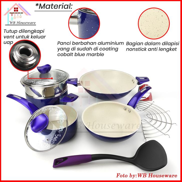 SUPRA NEW panci set 9pcs cobalt blue white marble series anti lengket / cookware / wajan masak rebus kukus