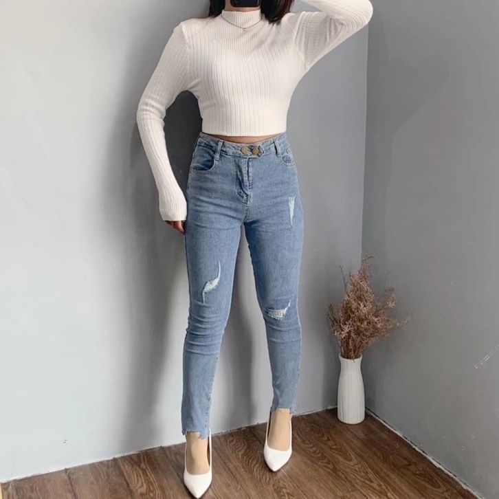 Celana Panjang Highwaist Wanita Skinny Jeans Wanita Motif Sobek