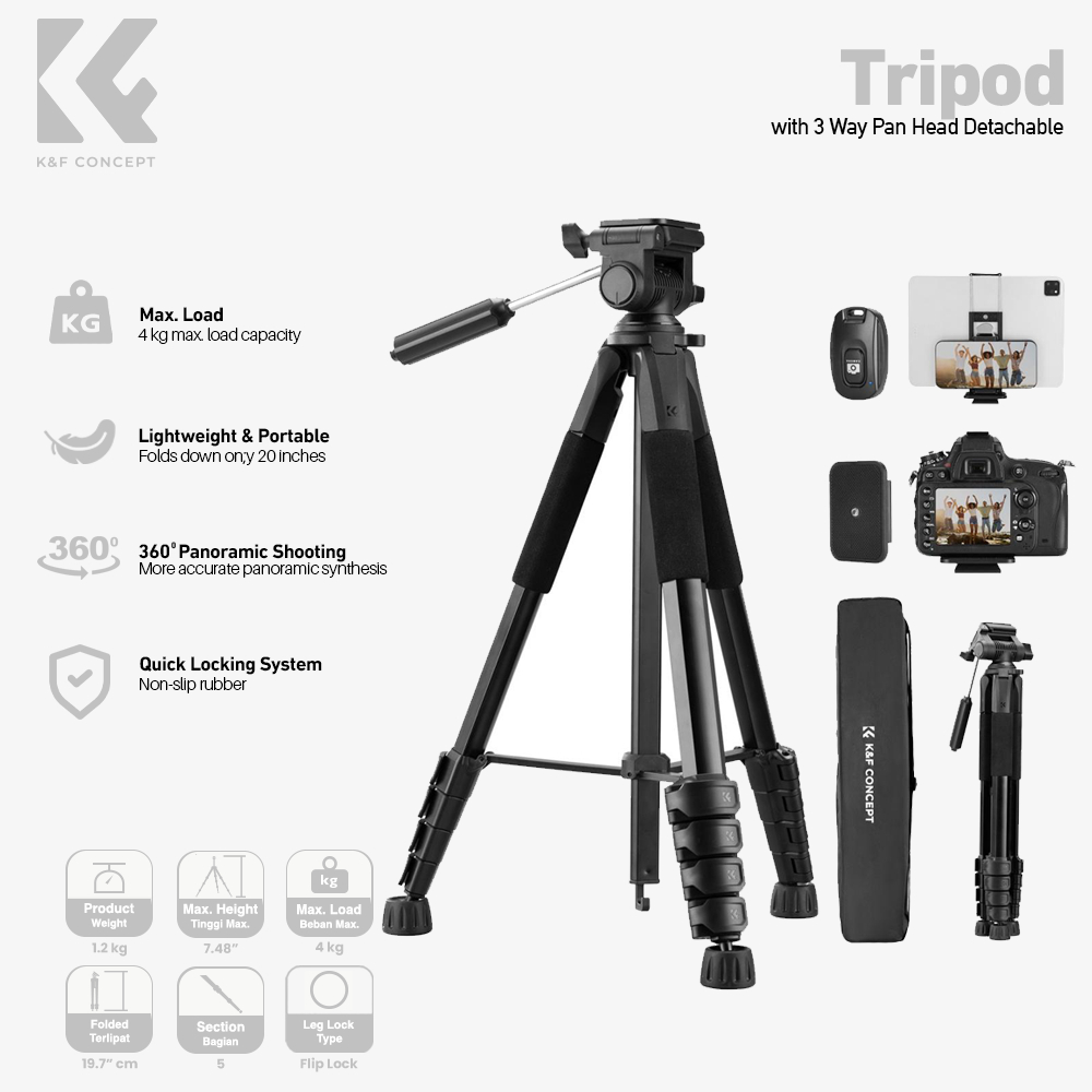 KNF Concept Camera Tripod S305A3+BV01 with 3 Way Pan Head Detachable