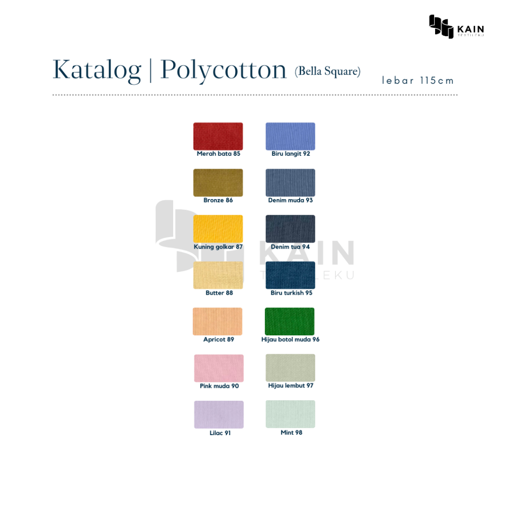 Hitam, Navy, Putih bw, Putih bersih, Silver, Abu muda, Abu Tua, Coksu muda, Cokrem, Coksu, Cokelat Muda, Milo, Cokelat, Moka, Pink dusty, Rose pink, Pink darwin, Kopi, Lavender, Orchid, Abu dusty, Taro, Marun, Merah ati, Merah cabe, Telur asin, Hijau botol, TNI, Olive, Lemon, Kubus, Salem, Semen, Toska tua, Brownie, Biru brunnera, Shitake, Hijau Muda, Ungu muda, Light sage, Stone, Caramel, Blush, Green tea, Irish, WARNA LAIN DKATALOG, Ungu terong, Merah bata, Lilac