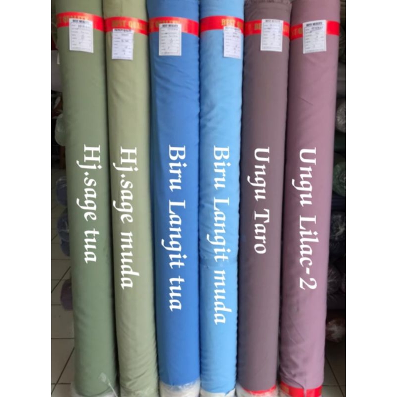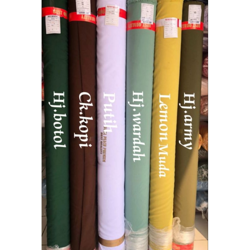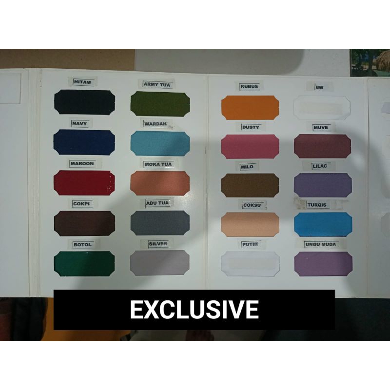 Hitam, Putih, Nevy, Maroon, Hijau Tua, Hijau botol, Warna sesuai chat, Olive, Hijau nu, Hijau toska, Biru toska, Hijau alpukat, Hijau daun, Mint, Biru wardah, Hijau wardah, Sage tua, Sage muda, Abu Tua, Abu muda, Lilac, Ungu Tua, Lavender, Biru turkis, Biru langit, Salem, Purple, M. Bata, Coksu, Mocca, Crem, Milo, Lemon, Benhur, Toska muda