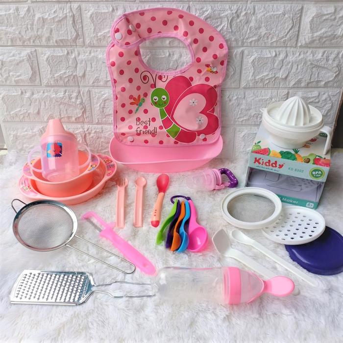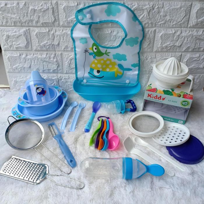 PAKET PERLENGKAPAN MPASI Lengkap food maker kiddy baby feeder slabber sendok mangkok bayi - 10in1 A BOY