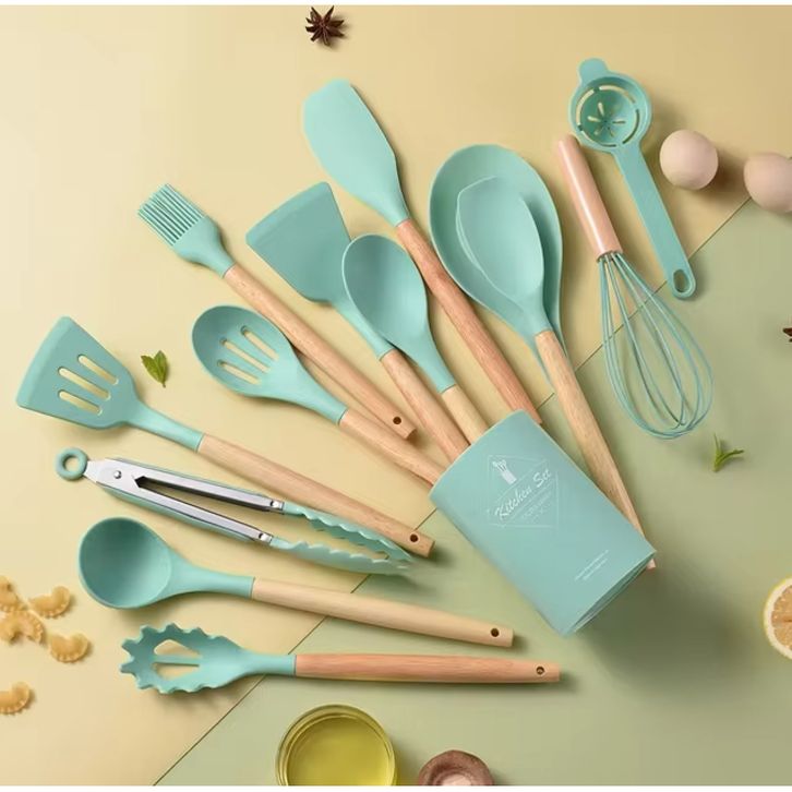 ORIGINAL Spatula Silicone Alat Masak Set 12pcs Pegangan Kayu Spatula Steak Clip Silikon Spatula Oil Brush ebomnl