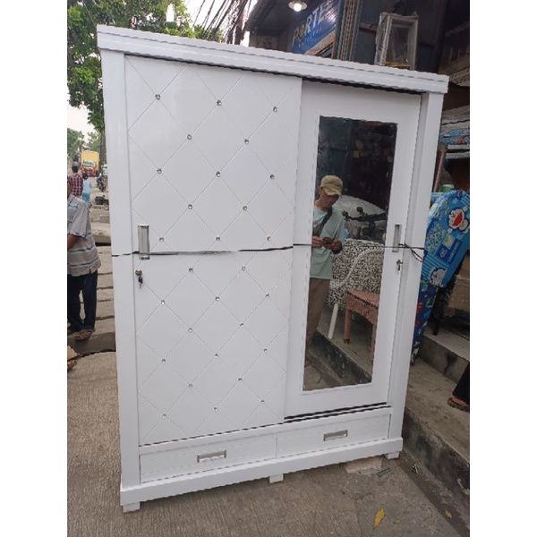 lemari baju pakaian pintu sleding geser kunci kaca laci bawah 2 kiri kanan ambal gantungan cermin kayu