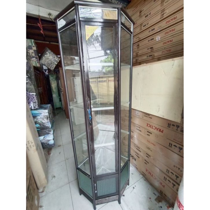 Bupet lemari pajangan sudut almunium kaca kunci kramik lampu kaki