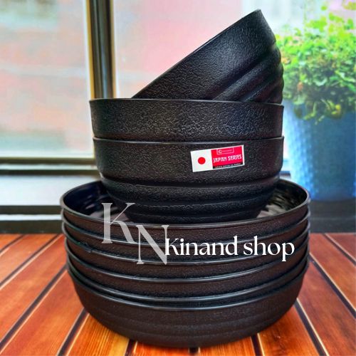 TERBARU piring set mangkuk ramen hitam plastik dop isi 6 pcs campur 3 piring 3 mangkuk ulir ramen ebogs