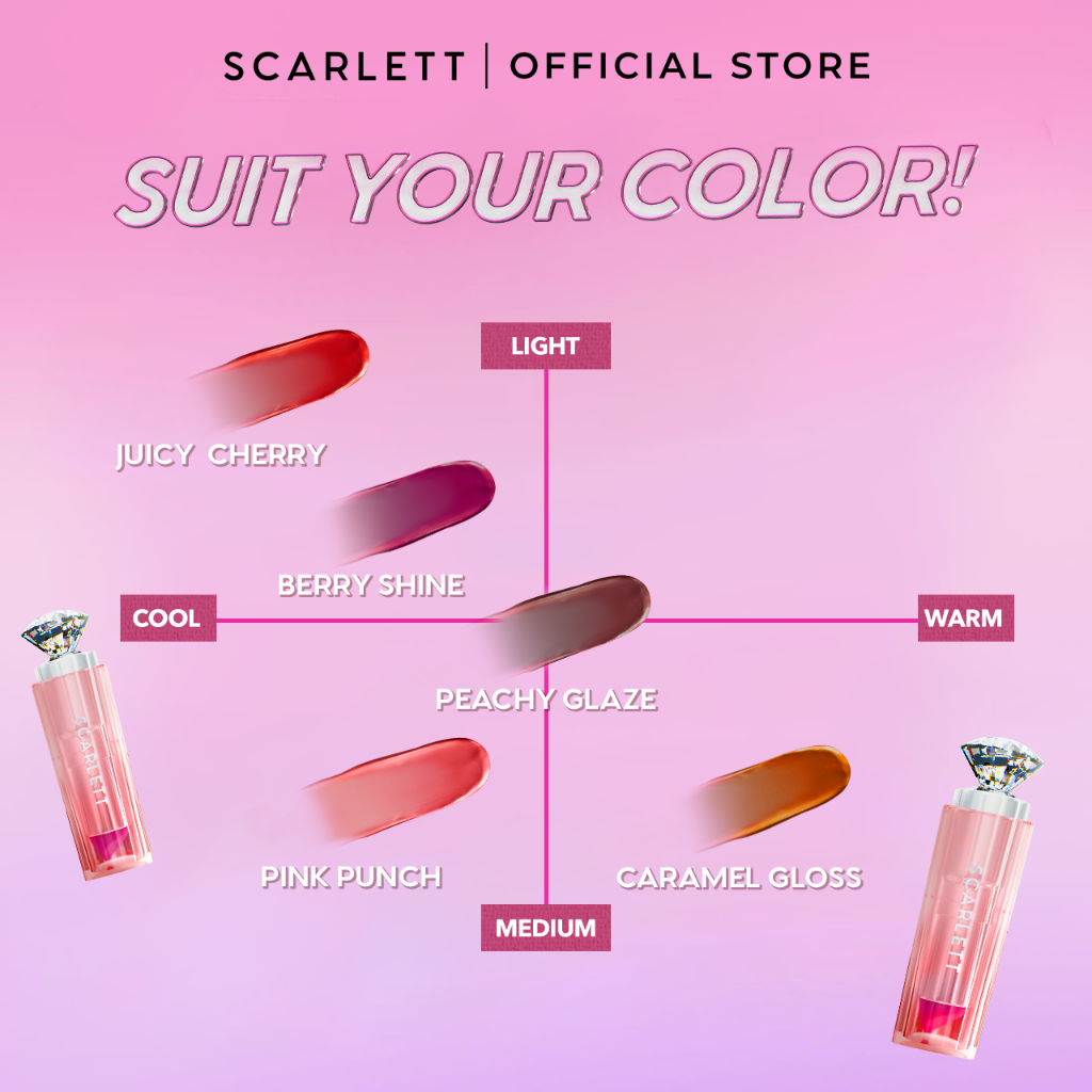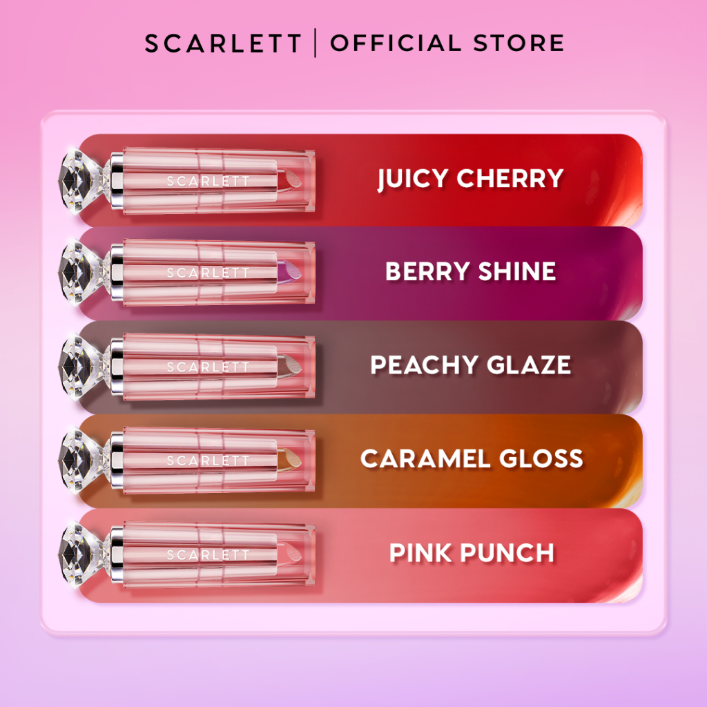 BERRY SHINE, PEACHY GLAZE, JUICY CHERRY, CARAMEL GLOSS, PINK PUNCH