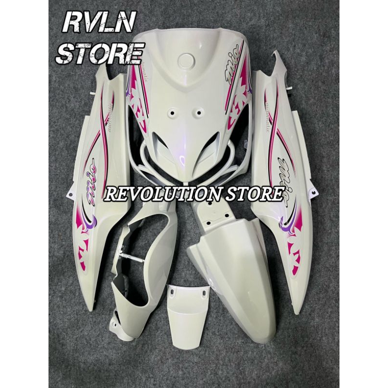 Cover ful body halus Yamaha Mio smile putih lembayung ungu striping bunga transparan - fullset body Mio smile putih