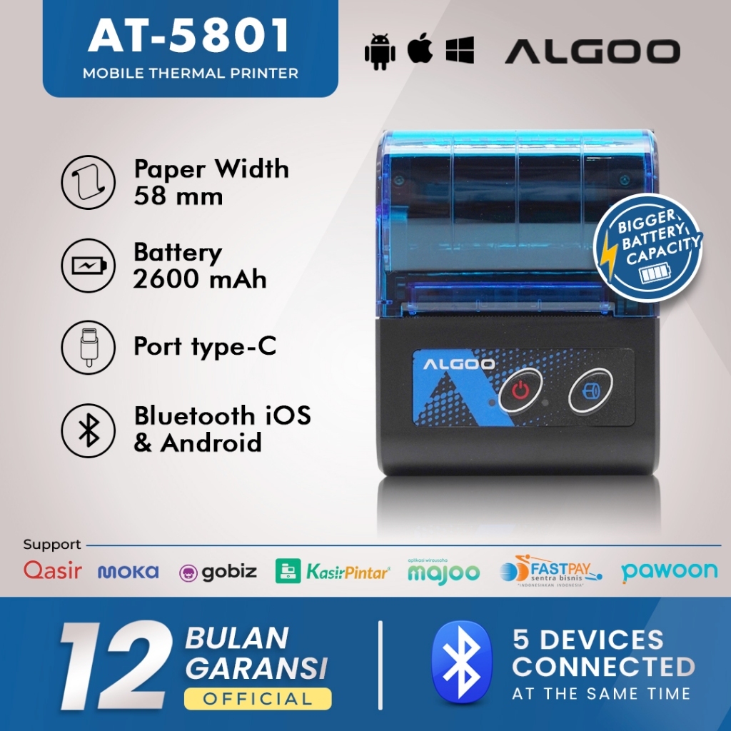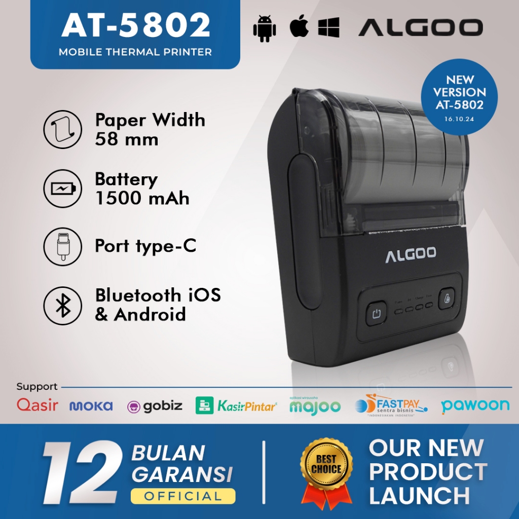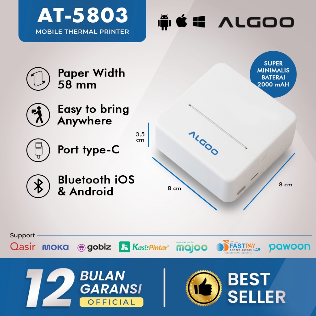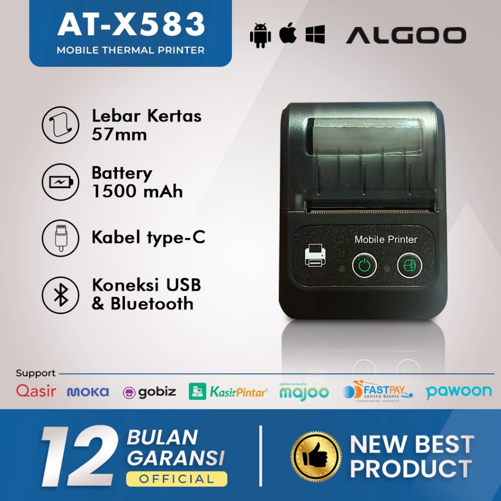 ALGOO Mini Printer Mobile Thermal Printer Struk Nota Bluetooth Dengan Baterai