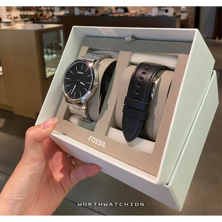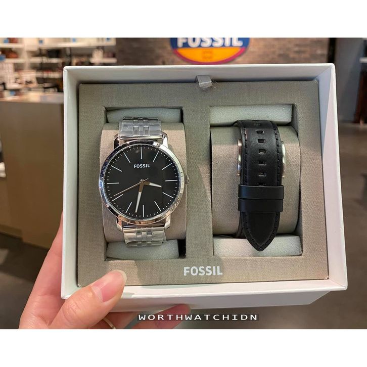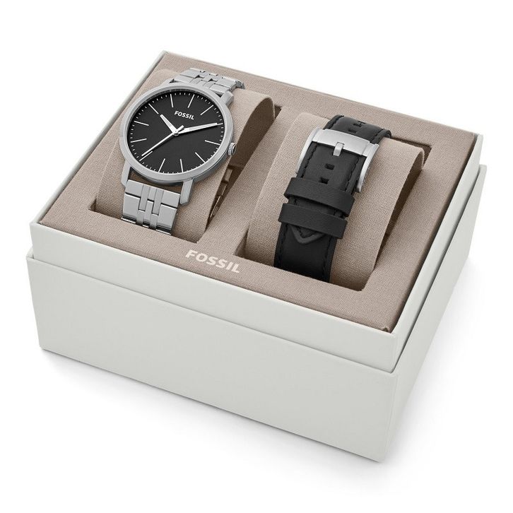 Jam Tangan Pria Gift Set Luther Three Hand Black Dial Silver Stainless Steel Bracelet + Extra Strap