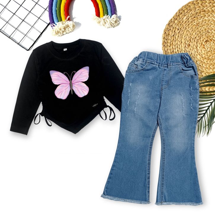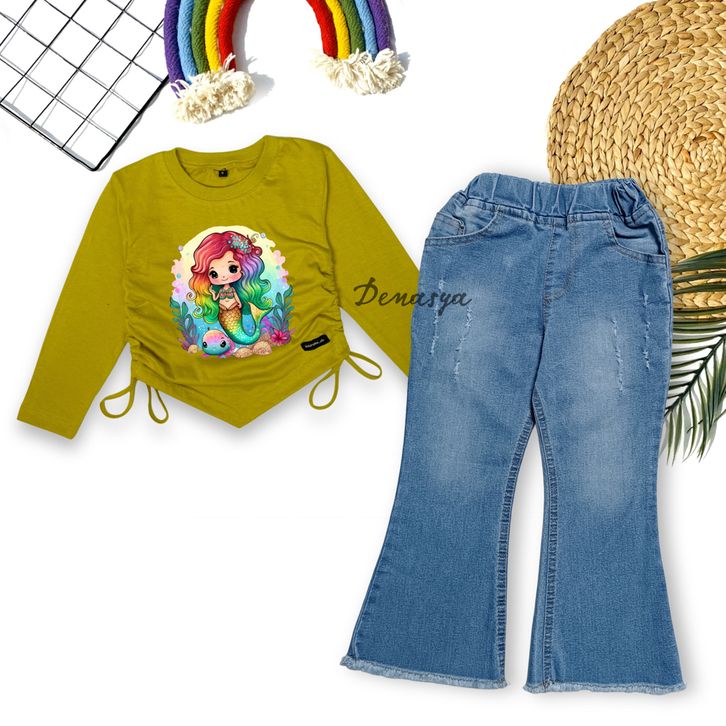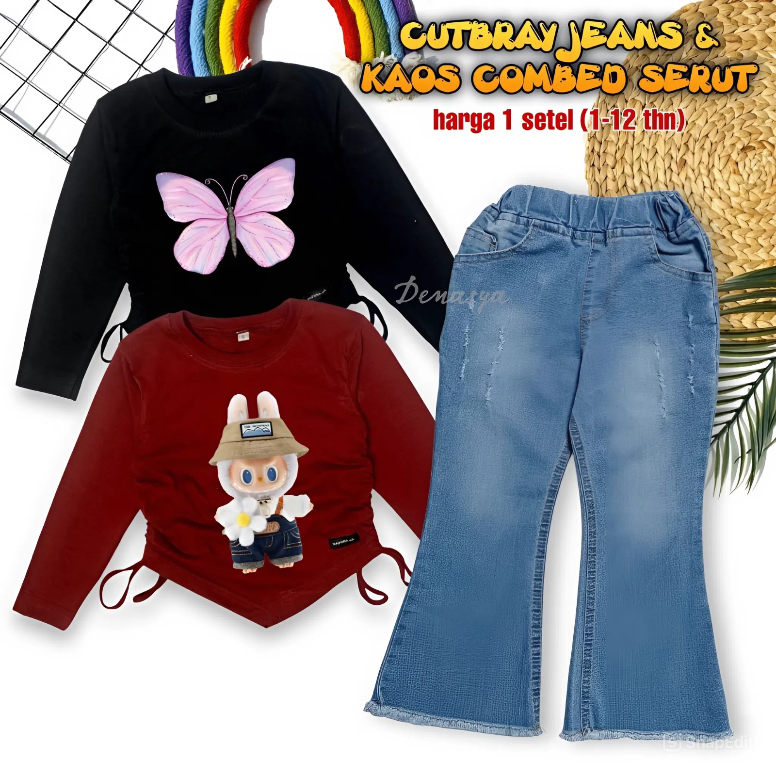 SETELAN JEANS ANAK PEREMPUAN KEKINIAN CELANA CUTBRAY ANAK PEREMPUAN + KAOS COMBED SERUT MOTIF SABLON LUCU 1-12 TAHUN
