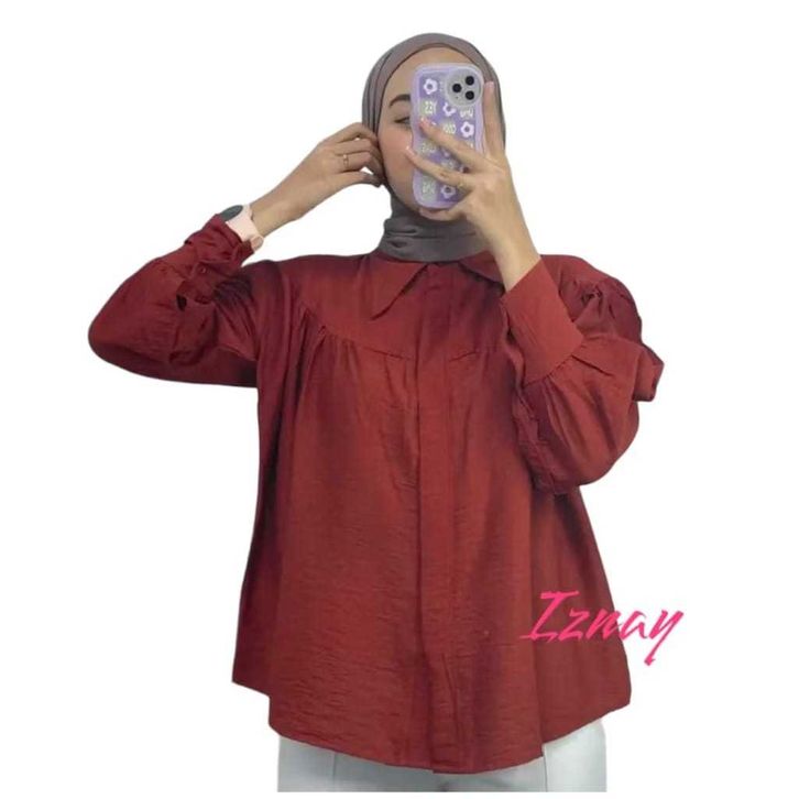 (Gratis Ongkir) Kemeja Blouse Sisil Polo Linen Lengan Balon Oversize