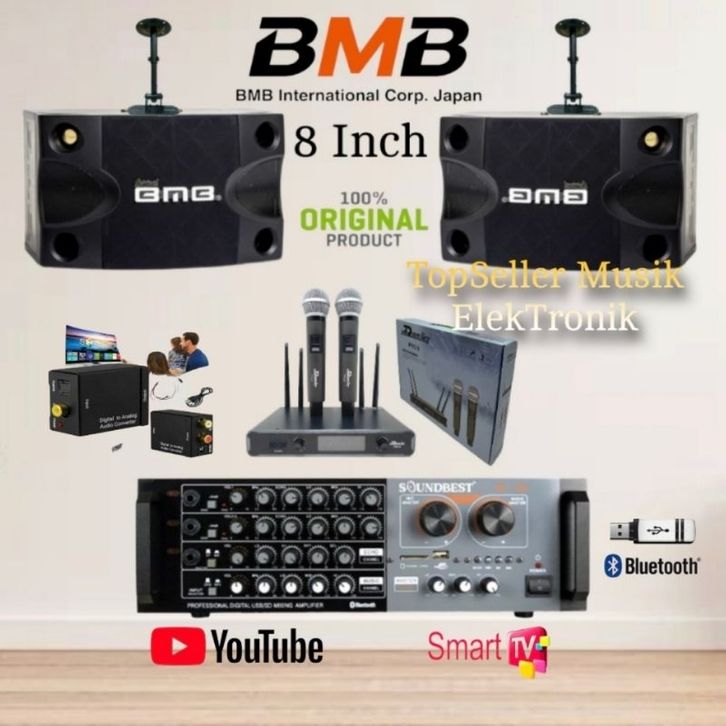 PAKET KARAOKE SOUND SYSTEM BMB 8 INCH AMPLIFIER KARAOKE 2MIC WIRELESS SMART TV YOUTUBE