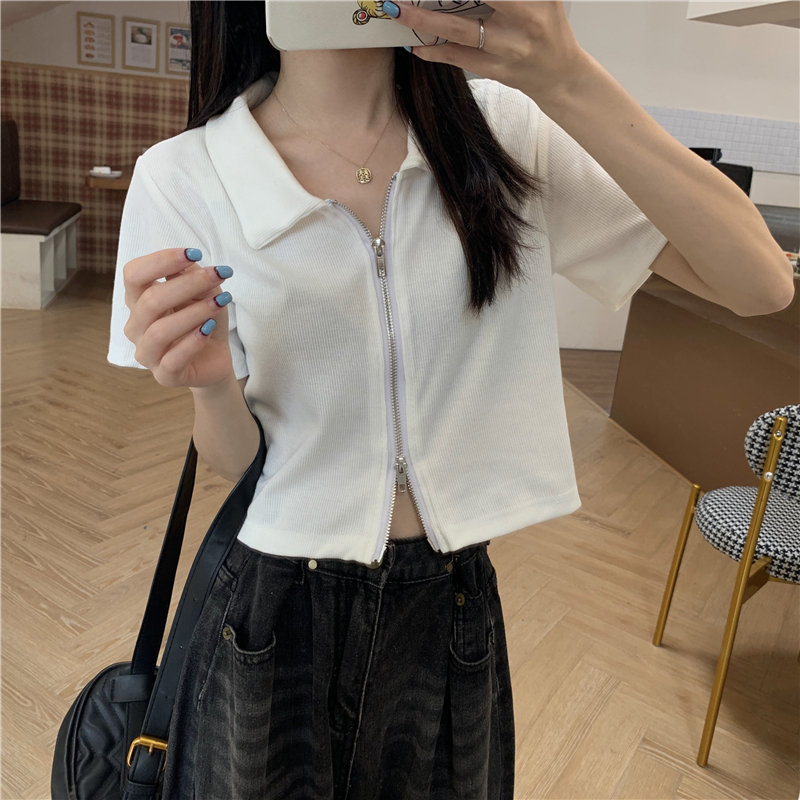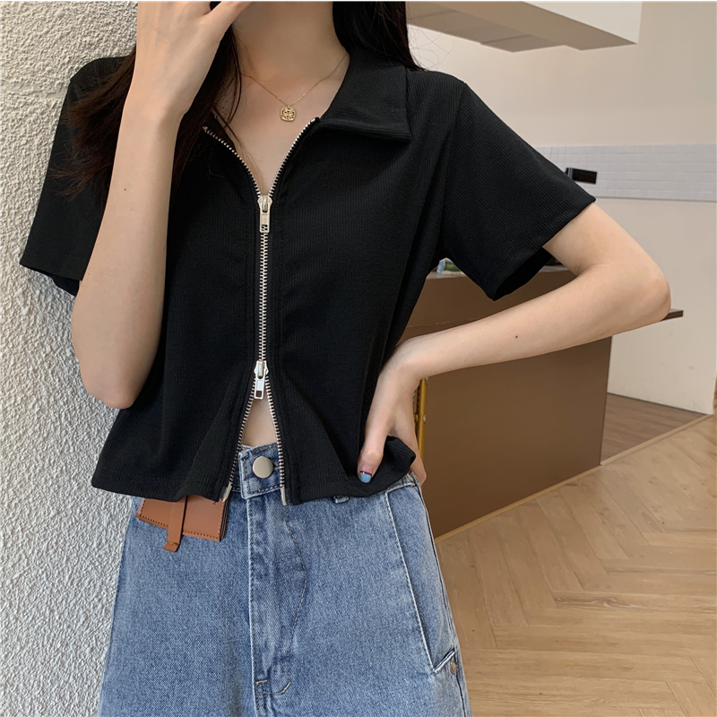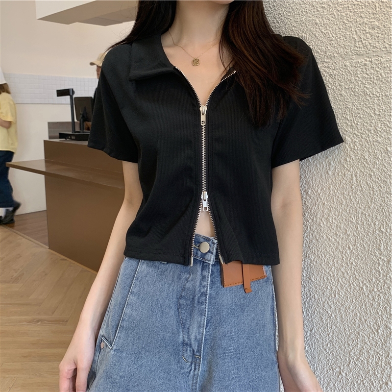 MISCO t-shirt crop top Hitam kaos wanita crop zipper lengan pendek kardigan Kaos Wanita Putih crop top polos kaus crop wanita baju atasan wanita terbaru crop top