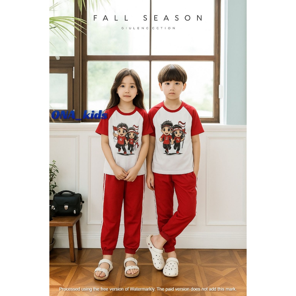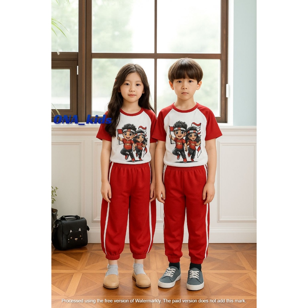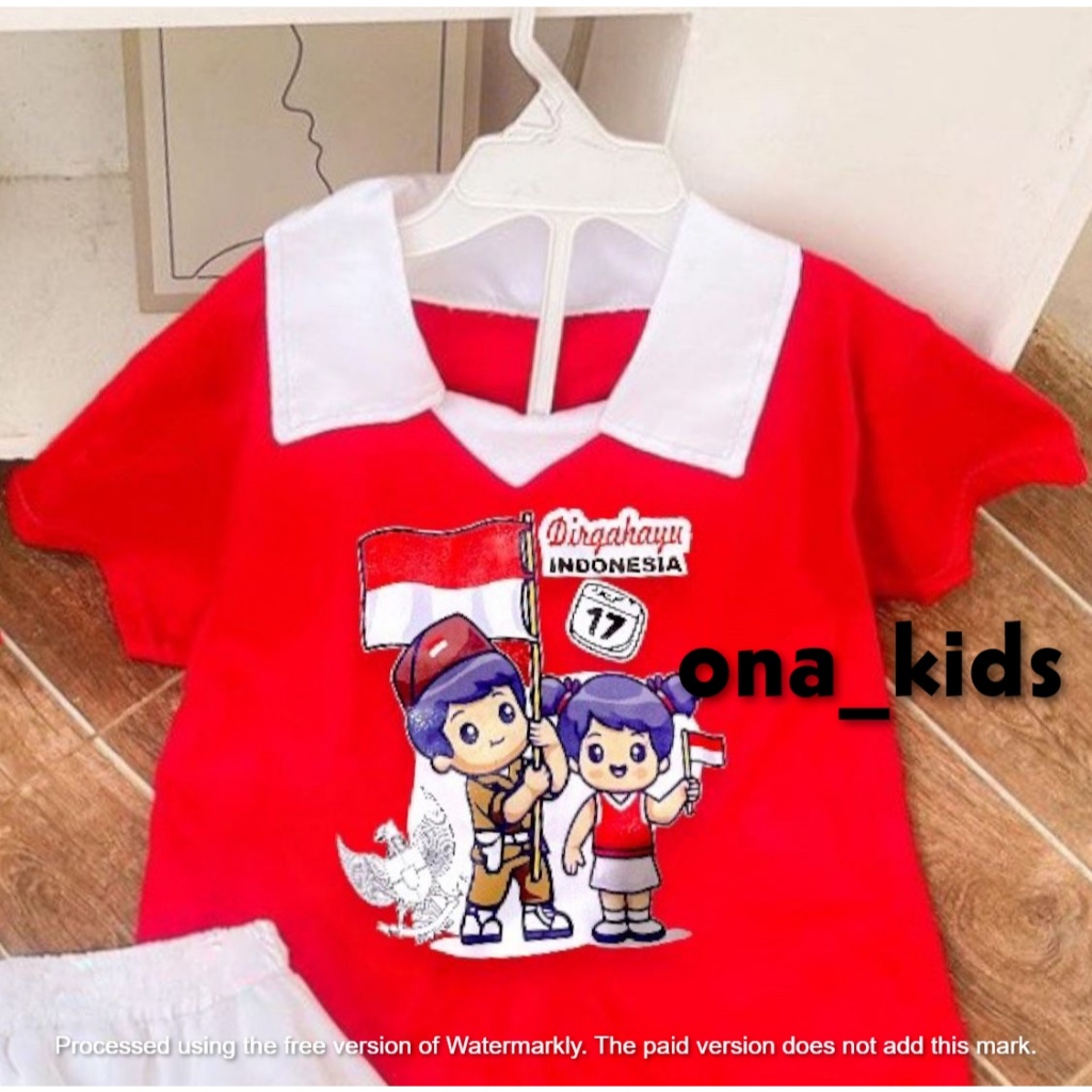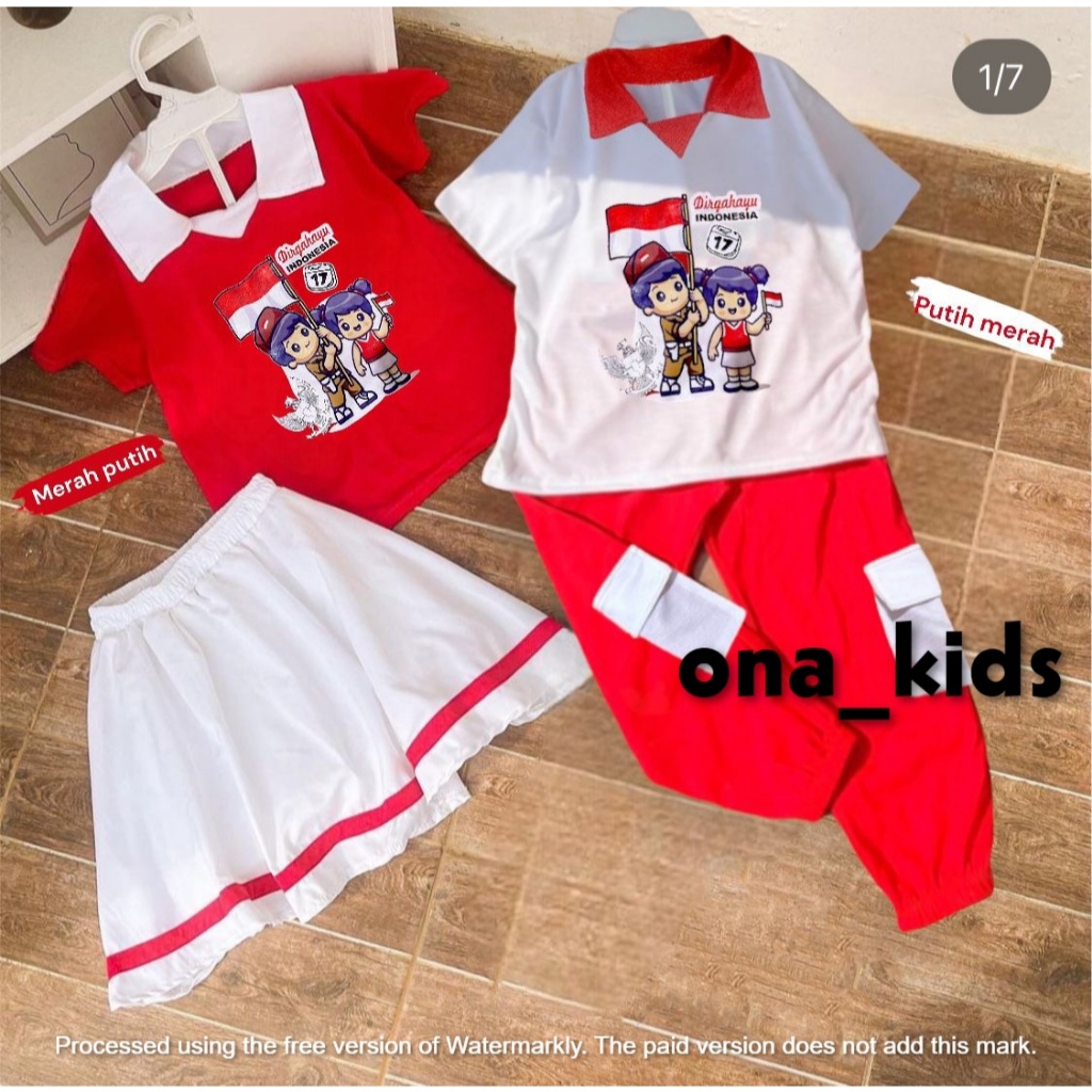 seetelan baju merah putihh kaos kerah kemerdekaan 17 agustus untuk anka laki laki dan perempuan model celana cargo dan rok usia 1-10 thn