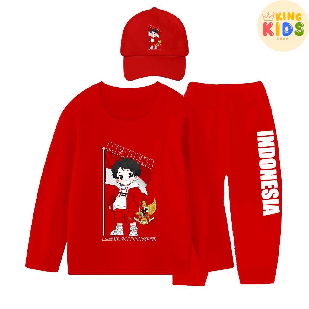 PAKET BAJU + TOPI KEMERDEKAAN RI 17 AGUSTUS 1945 Setelan Lengan Panjang Anak Laki-laki Usia 1-10 Tahun