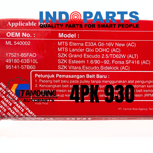 VAN BELT VANBELT FANBELT 4PK 930 Suzuki Grand Escudo 2,5 /TD62W untuk ALTERNATOR