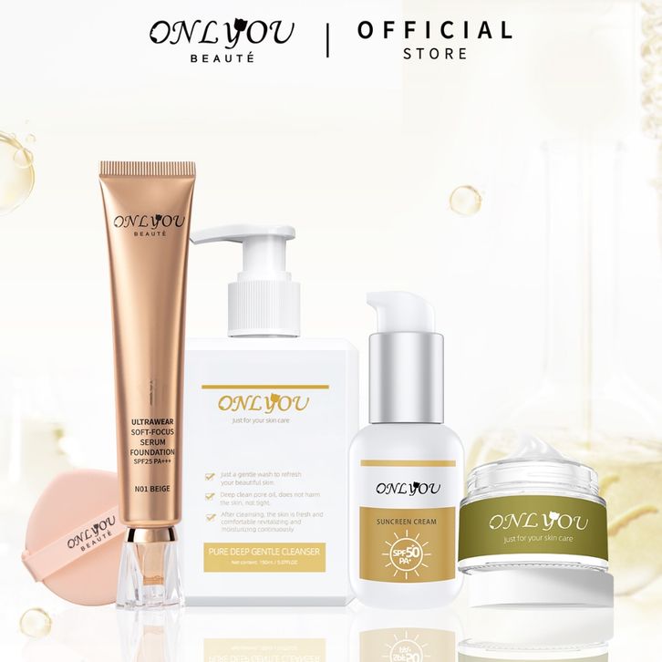 ONLYOU MAKEUP 5PCS PAKTE Menyegarkan Sunscreen Cream SPF 50+ PA+ 50G & Serum Foundation waterproof 30G & Whitening moist