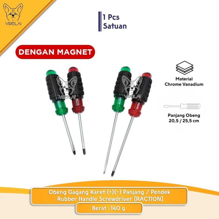 Obeng Gagang Karet Panjang / Pendek Magnet (+)(-) / Rubber Handle Screwdriver [RACTION]
