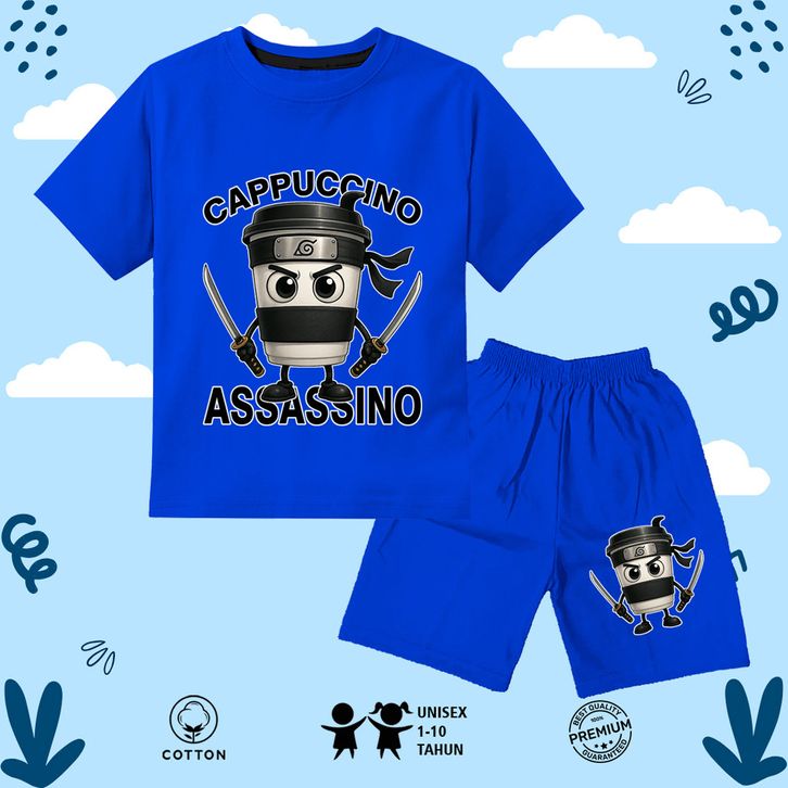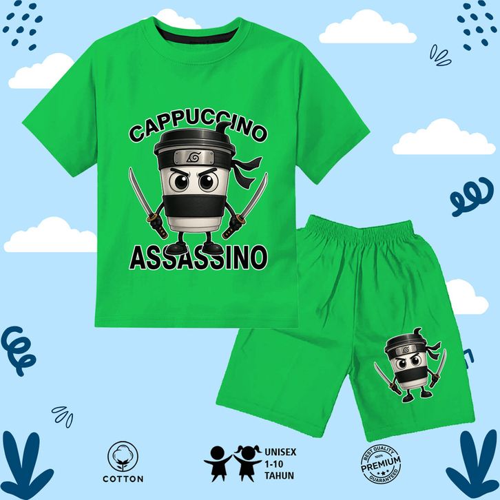 BAJU SETELAN STELAN SET KAOS ANAK COWOK CEWEK LAKI LAKI PEREMPUAN UNISEX MURAH MOTIF ANOMALI CAPPUCCINO ASSASSINO
